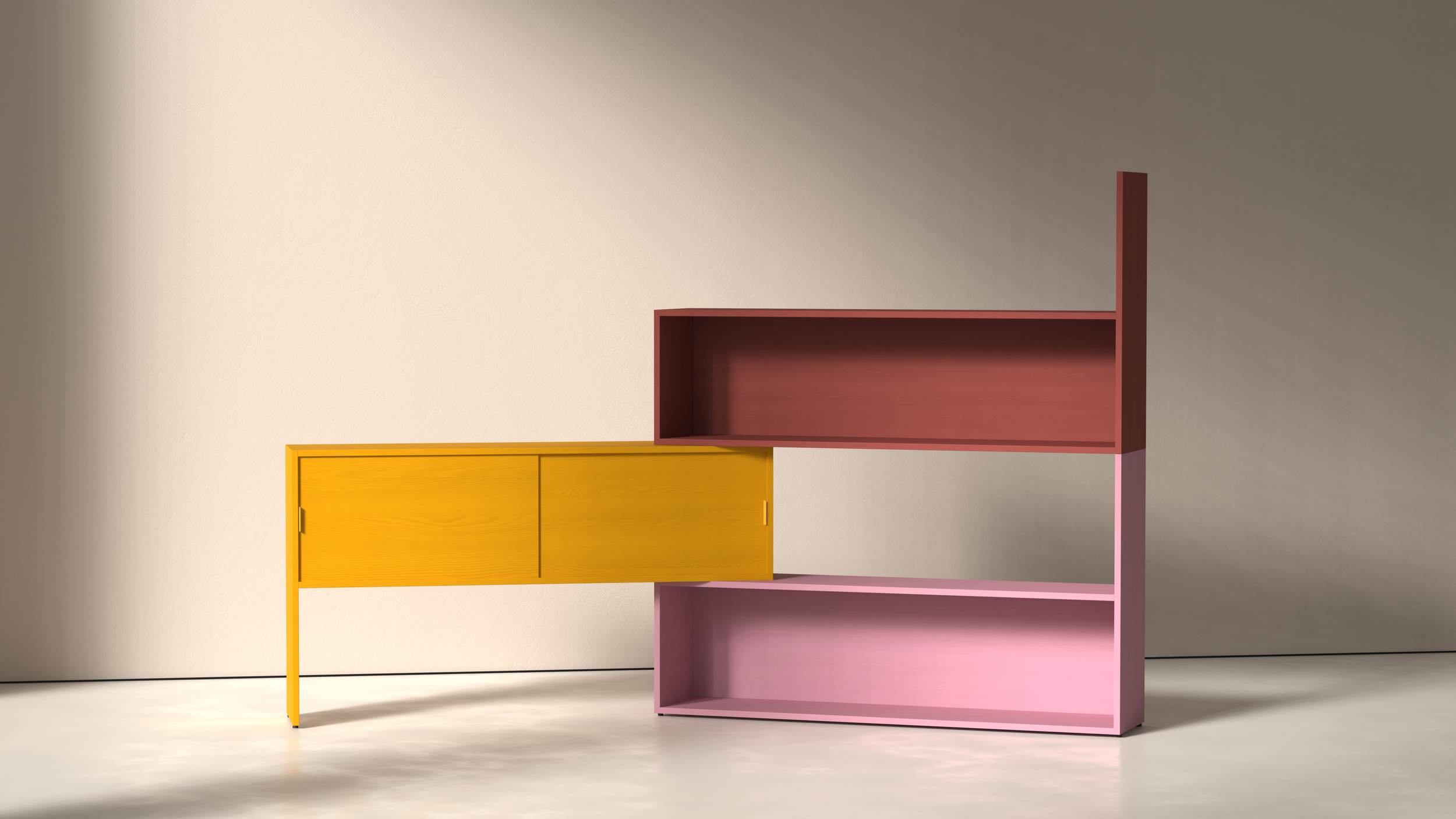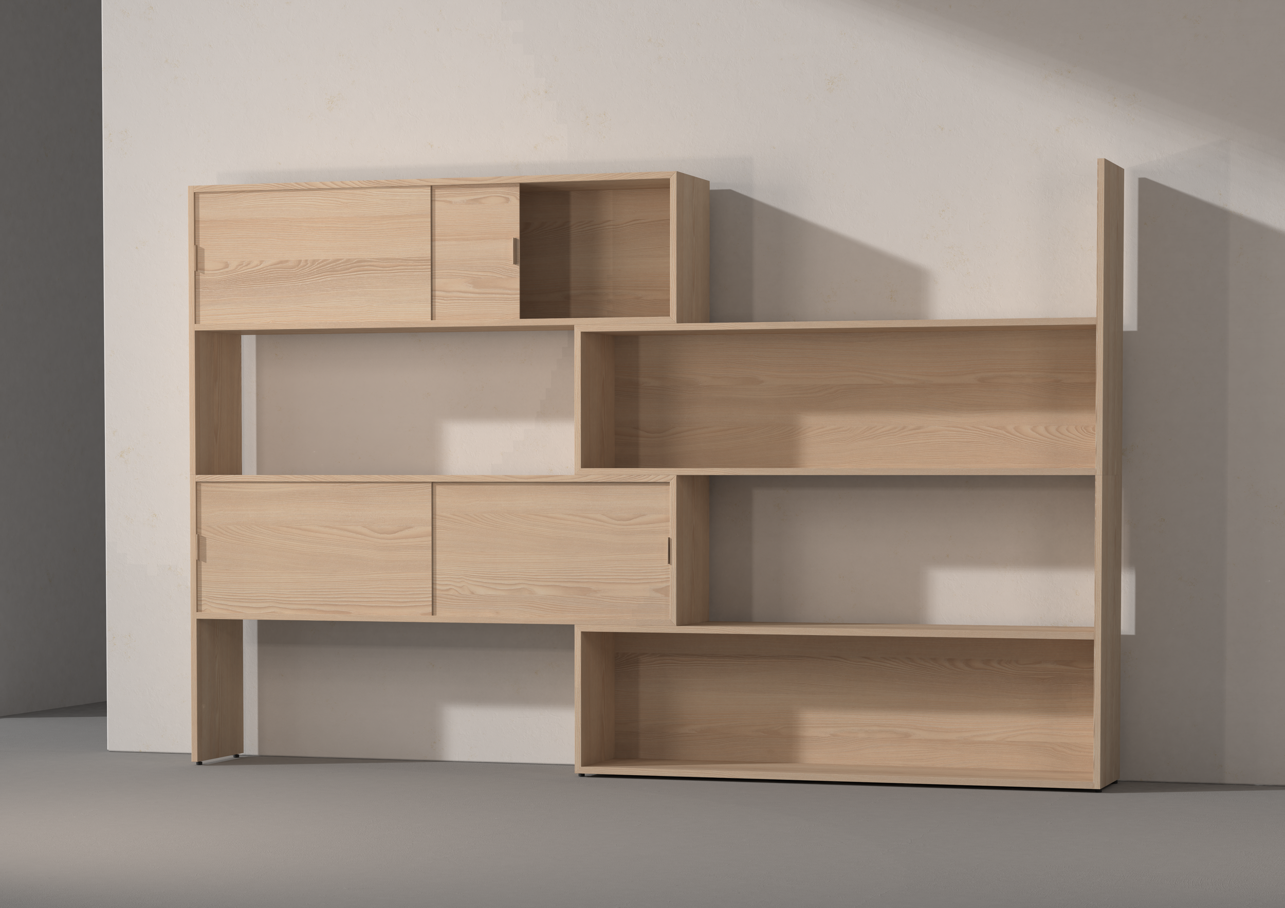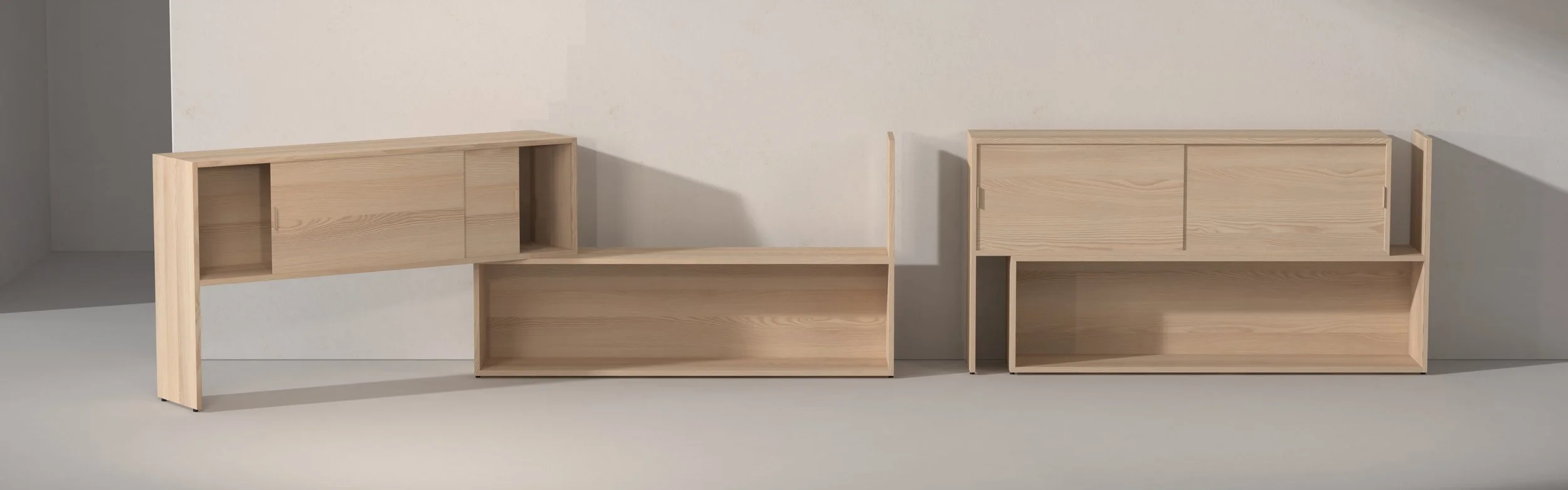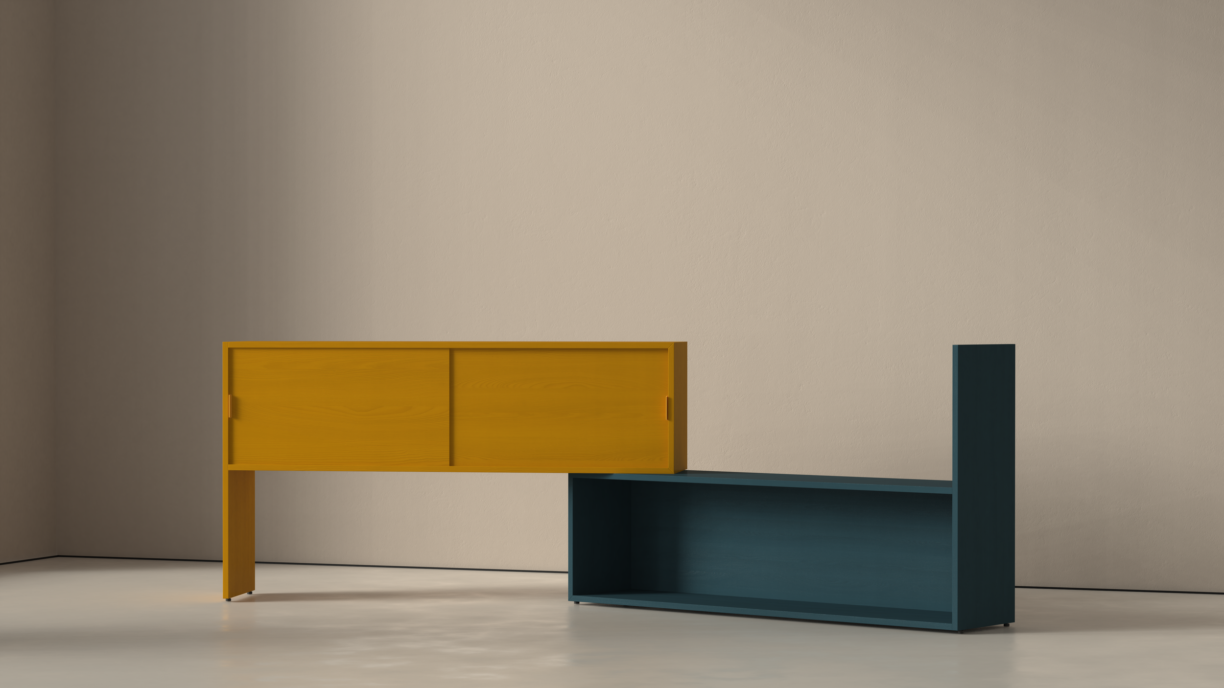 Grundmodul aus rechteckigem Korpus mit überlanger Seitenwand. Wahlweise mit Schiebetüren ausgestattet und individuell flexibel zu Sideboards, Regalwänden oder auch raumtrennenden Konfigurationen zusammensetzbar.